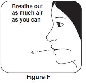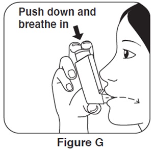 Step 4. Put the mouthpiece in your mouth and close your lips around it. Push the top of the metal canister firmly all the way down while you breathe in deeply and slowly through your mouth. See Figure G. |