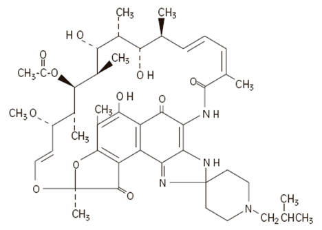 The chemical name for rifabutin is 1',4-didehydro-1-deoxy-1,4-dihydro-5'-(2-methylpropyl)-1-oxorifamycin XIV (Chemical Abstracts Service, 9th Collective Index) or (9 S,12 E,14 S,15 R,16 S,17 R,18 R,19 R,20 S,21 S,22 E, 24 Z)-6,16,18,20-tetrahydroxy-1'-isobutyl-14-methoxy-7,9,15,17,19,21,25-heptamethyl-spiro [9,4-(epoxypentadeca[1,11,13]trienimino)-2 H-furo[2',3':7,8]naphth[1,2-d] imidazole-2,4'-piperidine]-5,10,26-(3 H,9 H)-trione-16-acetate. Rifabutin has a molecular formula of C 46H 62N 4O 11, a molecular weight of 847.02 and the following structure: