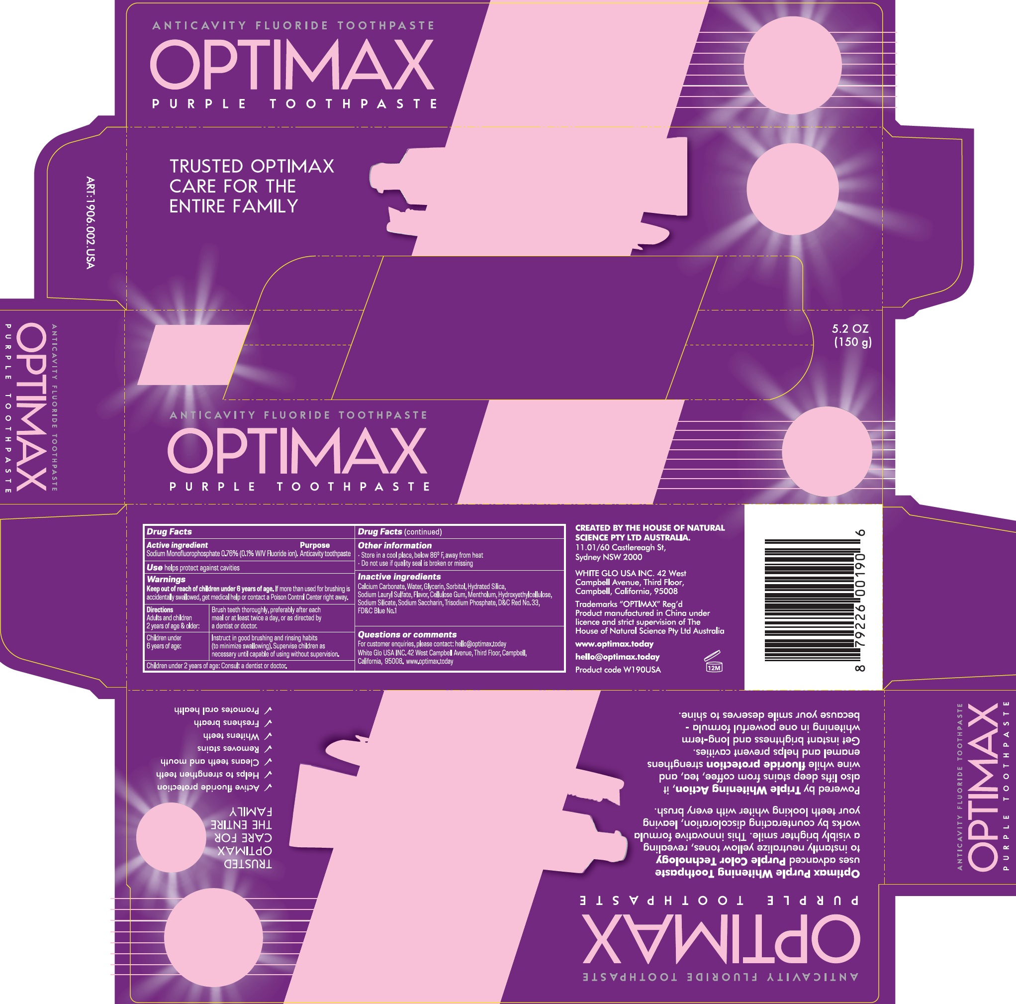 Optimax Purple Anticavity Fluoride by is a Otc medication manufactured, distributed, or labeled by WHITE GLO USA INC. Drug facts, warnings, and ingredients follow.