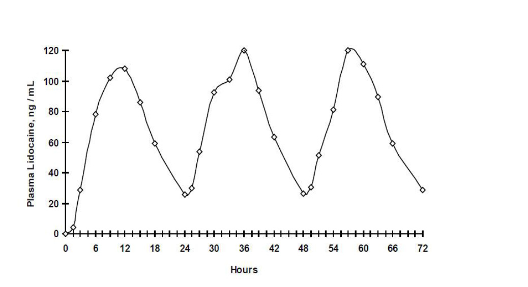 When lidocaine patch 5% is used according to the recommended dosing instructions, only 3 ± 2% of the dose applied is expected to be absorbed. At least 95% (665 mg) of lidocaine will remain in a used patch. Mean peak blood concentration of lidocaine is about 0.13 mcg/mL (about 1/10 of the therapeutic concentration required to treat cardiac arrhythmias). Repeated application of three patches simultaneously for 12 hours (recommended maximum daily dose), once per day for three days, indicated that the lidocaine concentration does not increase with daily use. The mean plasma pharmacokinetic profile for the 15 healthy volunteers is shown in Figure 1.