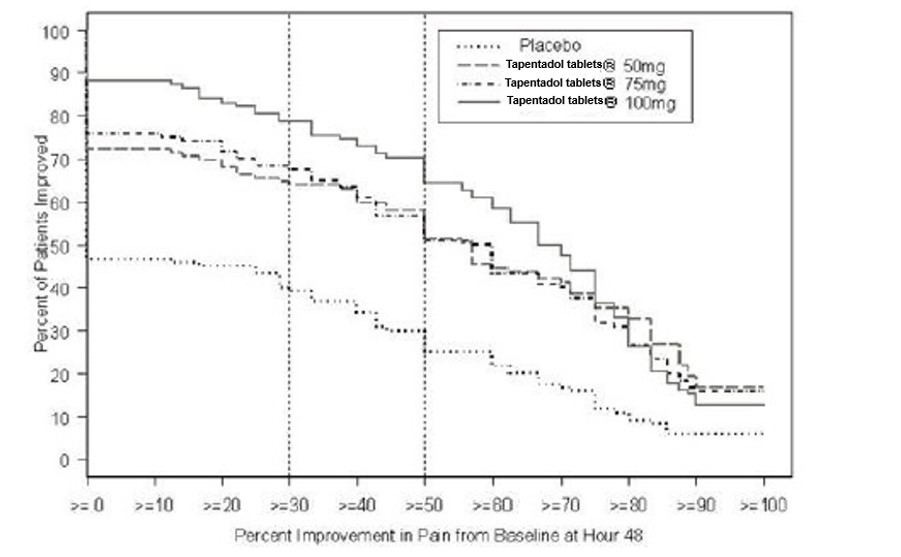 The proportions of patients who showed reduction in pain intensity at 48 hours of 30% or greater, or 50% or greater were significantly higher in patients treated with tapentadol tablets at each dose versus placebo.