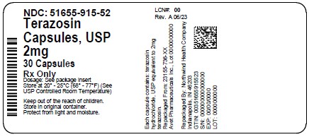 Terazosin Capsules, USP 2 mg, are available as size 3 yellow opaque cap and white opaque body hard gelatin capsules, imprinted with "736" on the cap and "2 mg" on the body in black ink, packaged in bottles of 30 NDC # 51655-915-52.